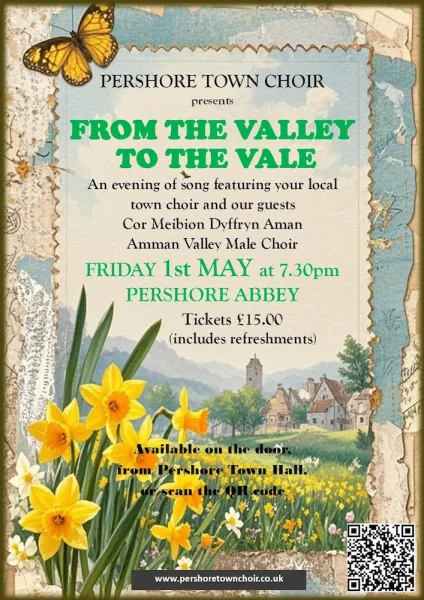 Meibion Dyffryn Aman back to Pershore. This wonderful male voice choir will be singing with us at a joint concert in Pershore Abbey on Friday 1st May. Use the QR code to book tickets – currently, there is no booking fee!